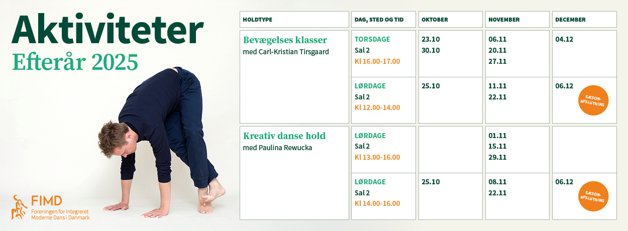 -Torsdage kl. 16-17, og hver 2. lørdag fra kl. 12-14; bevægelsesklasser med Carl-Kristian Tirsgaard